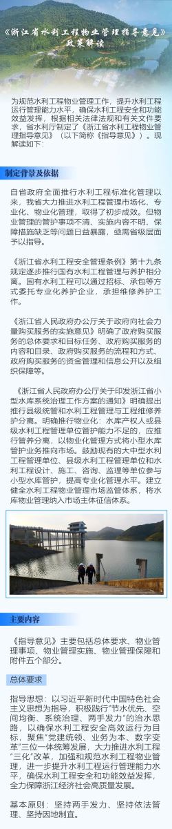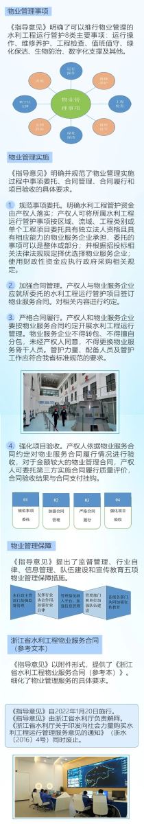 為規范水利工程物業管理工作,提升水利工程運行管理能力水平,確保水利工程安全和功能效益發揮,省水利廳制定了《浙江省水利工程物業管理指導意見》,于2022年1月20日起施行。《指導意見》主要包括總體要求、物業管理事項、物業管理實施、物業管理保障、物業服務合同(參考文本)等內容。