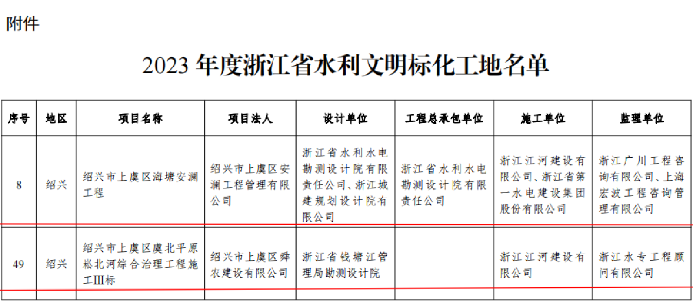 近日,公司承建的紹興市上虞區海塘安瀾工程、紹興市上虞區虞北平原崧北河綜合治理工程施工3標,被浙江省水利廳評為“2023年度浙江省水利文明標化工地”。